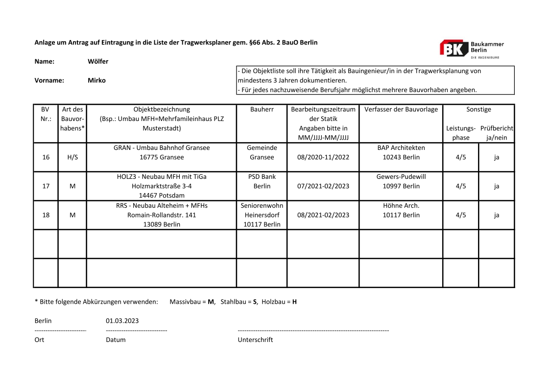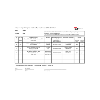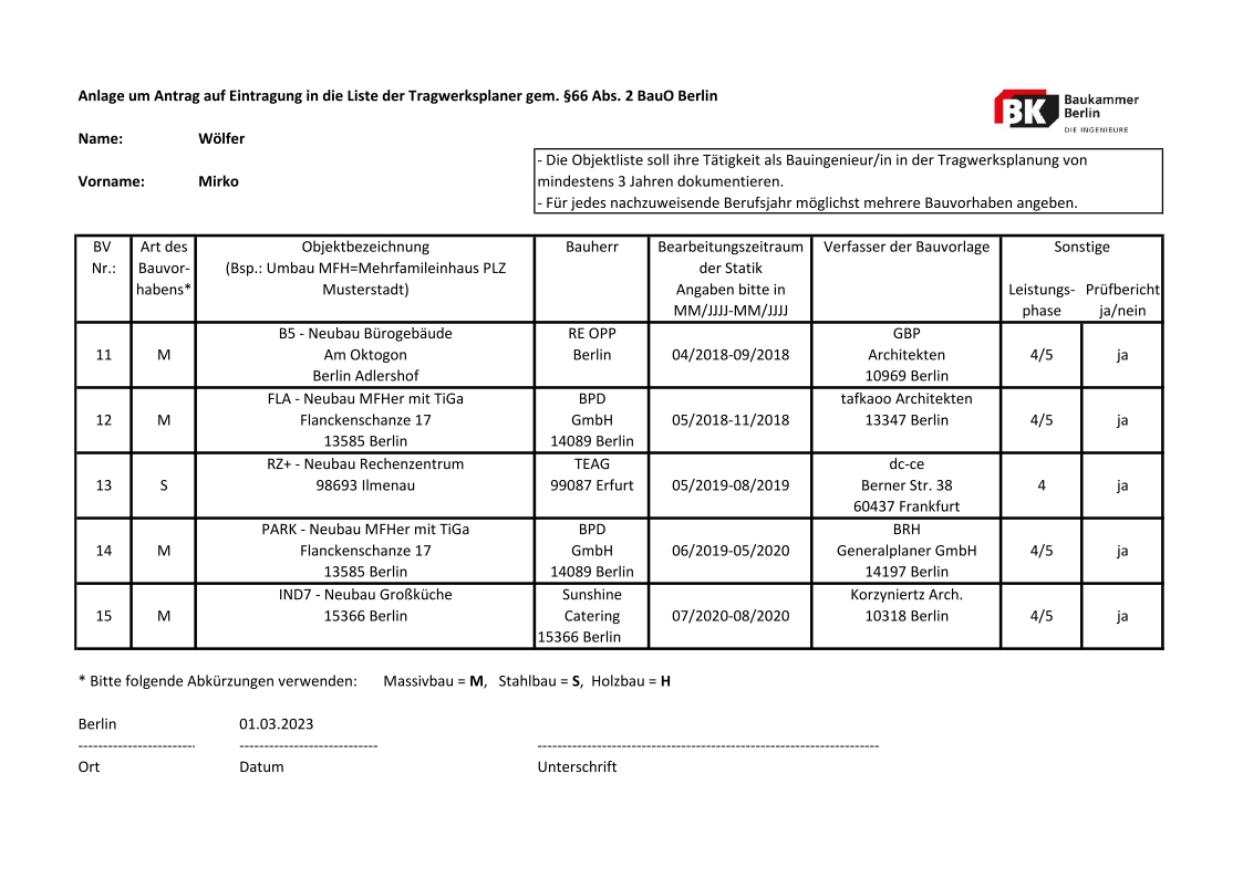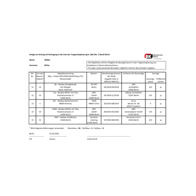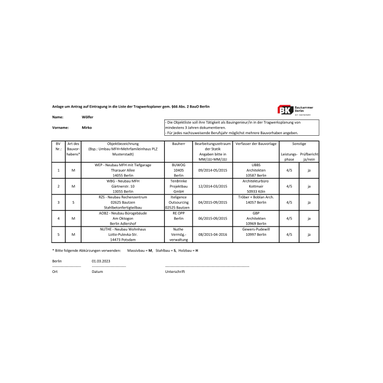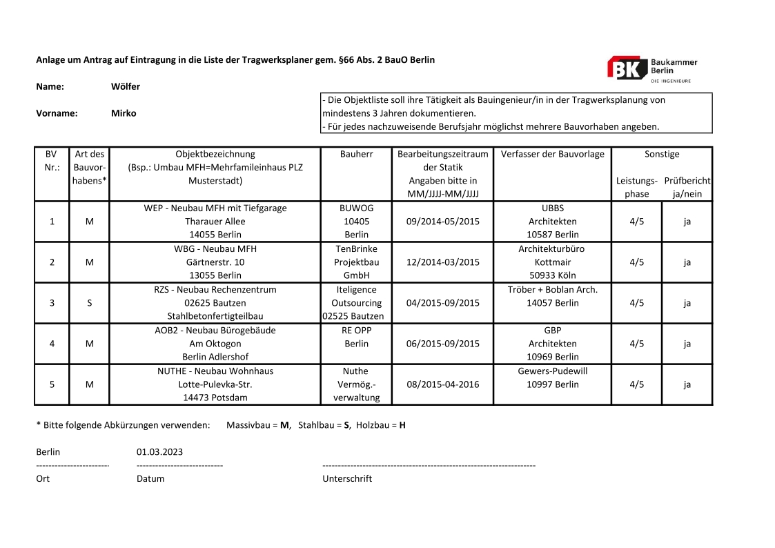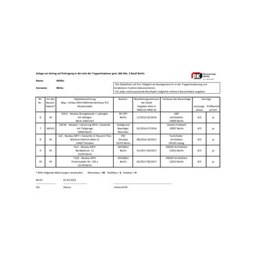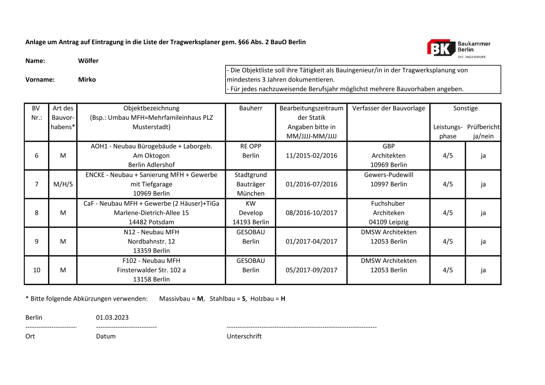 Ich bin in der Liste der Tragwerksplaner Berlin eingetragen, Mitglied der Baukammer und spezialisiert auf die Fachbereiche Hochbau und Baustatik/Tragwerksplanung.